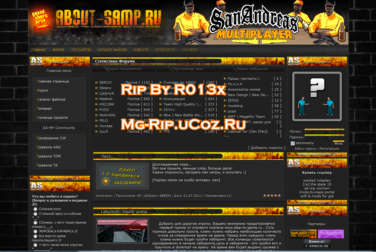 RIP шаблона сайта about-samp.ru для ucoz. Рипнул - RO13X. Сразу хочу отметить, что у дизайна рабочий конструктор. Тематика шаблона - всем хорошо известная игра GTA San Andreas. В архиве есть вид материалов.