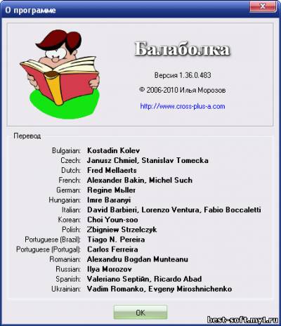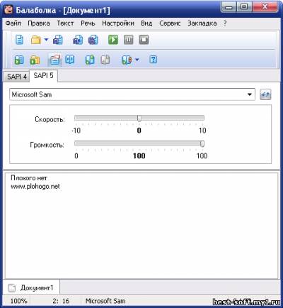 Балаболка - программа предназначена для чтения вслух текстовых файлов. Для воспроизведения звуков человеческого голоса могут использоваться любые речевые синтезаторы, установленные на компьютере.